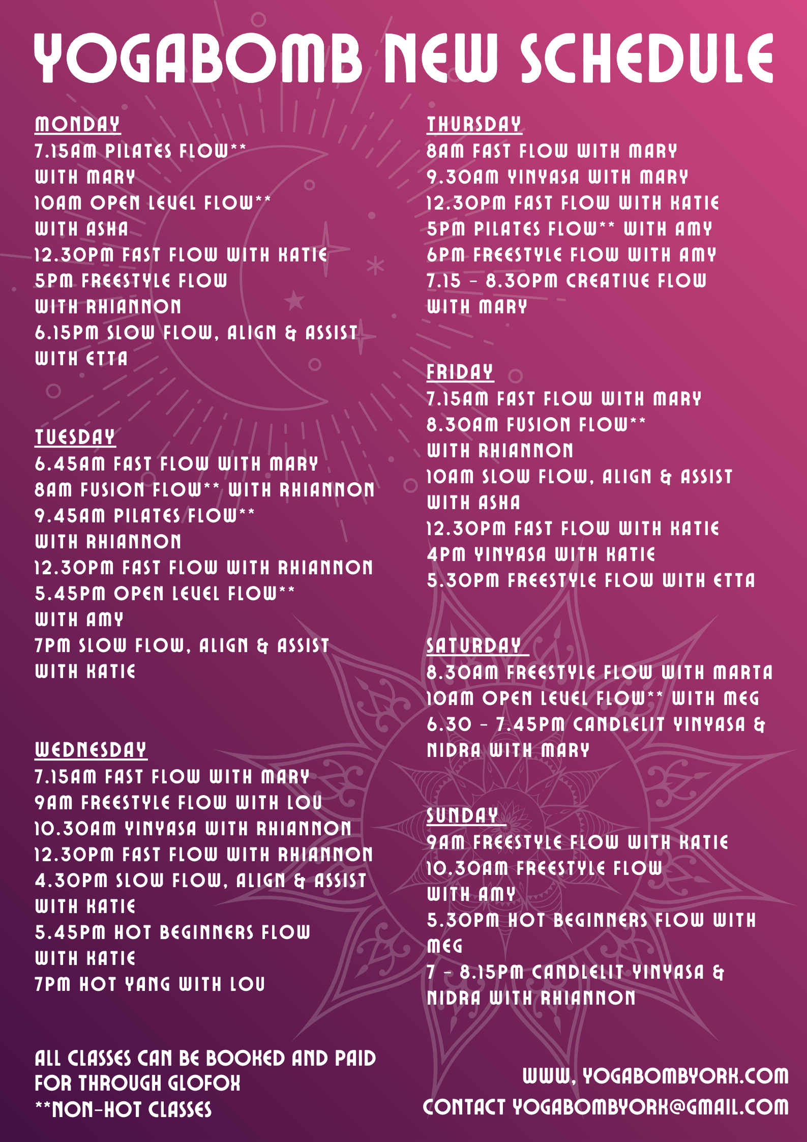 Please check up to date classes on the glofox app, through classpass, or by contacting us on lou@yogabombyork.com you can also call/whatsapp on the following number 07960011617